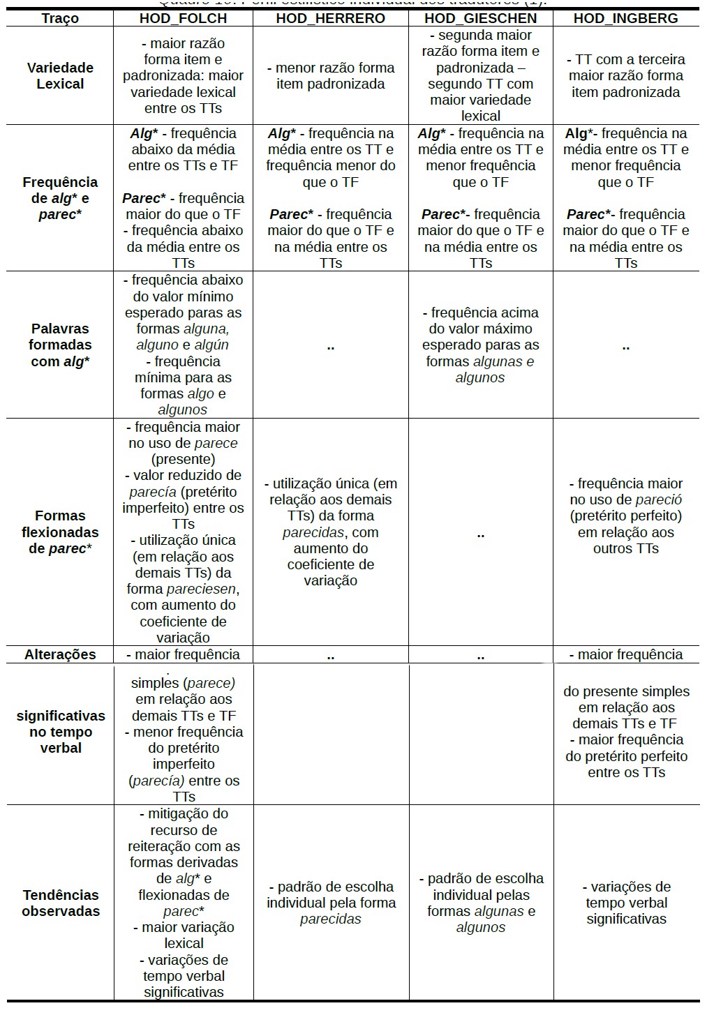 Assim, este estudo partiu da lacuna apontada por Stubbs (2003, 2005) em relação ao estilo de HOD, a de que as palavras gramaticais e sua fraseologia ainda não haviam sido investigadas para que se pudesse descobrir mais sobre o estilo de HOD. Portanto, esta pesquisa teve como enfoque a investigação dos itens formados a partir de alg* e parec*, como tradução de some* e seem* do TF, e comparou os dados com os do TF para se obter mudanças formais opcionais nas traduções desses itens lexicais.