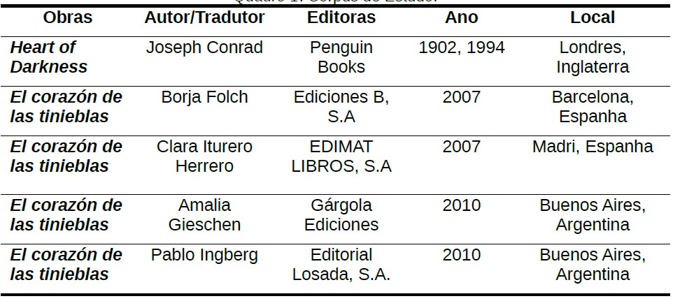 O corpus da pesquisa é paralelo e composto pelo texto-fonte, a obra Heart of Darkness de Joseph Conrad, publicada em 1902, e por quatro traduções para o espanhol desta obra. O presente corpus de estudo faz parte do Corpus de Estilo da Tradução – ESTRA (MAGALHÃES, 2014) e é constituído por TTs de tradutores diferentes de um mesmo TF, segundo orientação na literatura de estudos de estilo da tradução e do tradutor para o tipo de corpus adequado para este estudo.