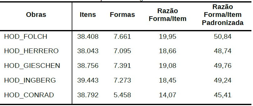 Segundo dados da Tabela 1, os TTs e o TF têm tamanhos aproximados de acordo com o número total de itens, uma vez que todos têm em torno de 38.000 palavras, com exceção de HOD_Ingberg. A tradução de Pablo Ingberg apresenta um número maior de itens em relação às outras traduções e em relação ao texto-fonte. As traduções restantes analisadas são menores do que o texto-fonte em relação ao número total de itens usados, sendo HOD_Gieschen a que possui uma quantidade aproximada de itens em relação ao TF. No entanto, apesar das diferenças em relação ao número de itens de cada tradução, a razão forma/item padronizada das traduções é maior do que aquela do texto de Conrad. Isso é devido ao fato de que o número de formas utilizadas nos TTs é maior do que o número usado no TF, sendo HOD_Folch o que apresenta o maior número de formas, bem como a maior razão forma/item.