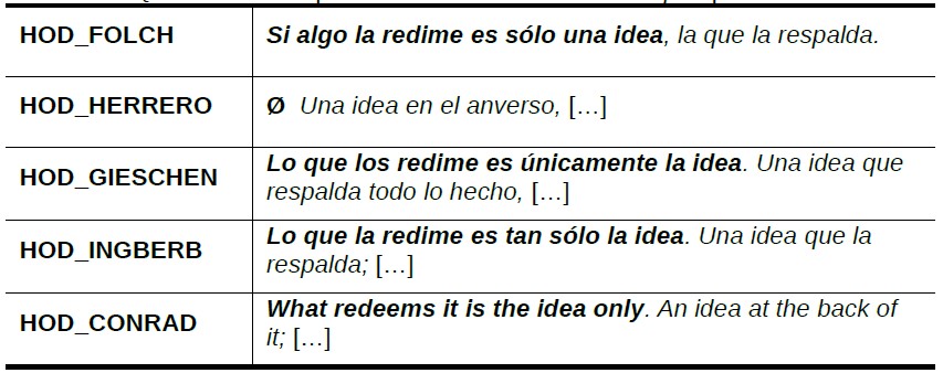 O Quadro 2 apresenta as diferenças nas escolhas lexicais entre os tradutores para a parte inicial da oração “What redeems it is the idea only”. Vê-se que Folch foi o único tradutor que acrescentou o pronome algo, derivado de um dos nódulos em investigação, e conferiu um tom de incerteza à oração, inexistente no TF. Folch também foi o único tradutor a mudar a pontuação da oração, diminuindo a fronteira entre as duas orações. Herrero não traduziu a primeira oração, realizando um procedimento de omissão. Gieschen opta por traduzir o pronome “it” por “los” alterando assim o número e gênero em relação aos outros TTs e ao TF. Por fim, Ingberg é o tradutor que mais manteve proximidade com as escolhas do autor, isto é, o que menos apresentou variações no excerto de texto analisado.