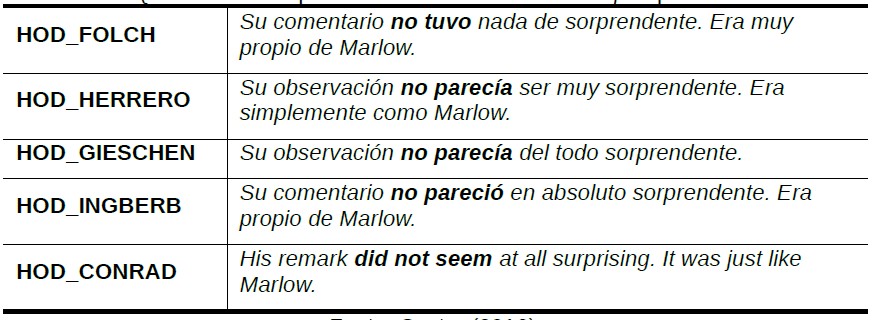 Observa-se, ainda, a escolha de Folch pela omissão da oração inteira no exemplo do Quadro 4, sendo a única tradução a ter optado por esta omissão. Tal omissão, juntamente com a escolha por itens lexicais diferentes daqueles equivalentes mais óbvios em espanhol para traduzir os itens com o lema seem*, pode indicar o uso de possíveis procedimentos de Folch para mitigar o recurso de reiteração presente na obra de Conrad, ou pode indicar a preferência desse tradutor pela escolha de itens lexicais distintos, o que revela traços de seu estilo.