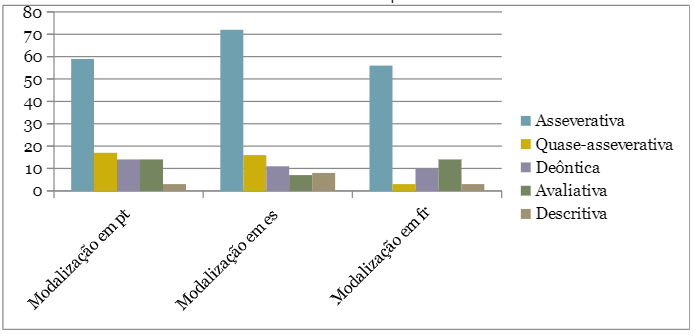 Com a análise dos corpora, foi possível verificar que é o tipo de modalização mais empregado nos resumos utilizados para esse estudo, tanto em português quanto nas demais línguas. Em português, ela aparece mais de 50 vezes no corpus; em espanhol, mais de 70; e em francês, mais de 50. Exemplos de enunciados: