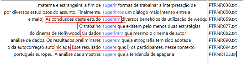 (1) Com base na tabela preenchida no Módulo 1, sugere-se ao usuário que selecione 2 tipos de modalização e seus respectivos índices, para iniciar a investigação com o Concordanciador. Levantados os dados na ferramenta, deverá então selecionar os contextos pertinentes para o estudo comparativo – aqueles em que o locutor introduz a informação relativa à apresentação dos resultados e/ou à parte conclusiva do trabalho –, como ilustramos a seguir com a busca de suger* (sugerir) no corpus em português.