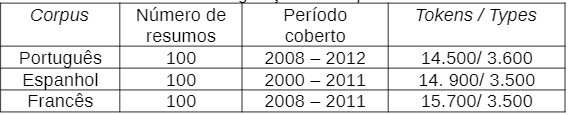 Para a realização deste trabalho, analisaram-se resumos da área de Linguística em português, espanhol e francês, extraídos dos seguintes corpora textuais: