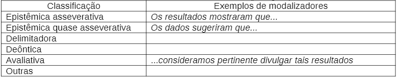 Após análise prévia de uma amostra de resumos dos corpora e da identificação de suas partes e estruturas prototípicas, verificamos que a presença de modalizadores era mais evidente na apresentação dos resultados e/ou conclusão, parte cuja análise foi privilegiada neste estudo8. Não por acaso, sobretudo em pesquisas de ciências humanas, como os estudos da linguagem, a conclusão exige uma tomada de posição do pesquisador, o que se refletirá nos textos. As construções encontradas eram associadas à classificação de Nascimento e Lima (2012), que identificaram as seguintes formas de modalização9 em resumos científicos: