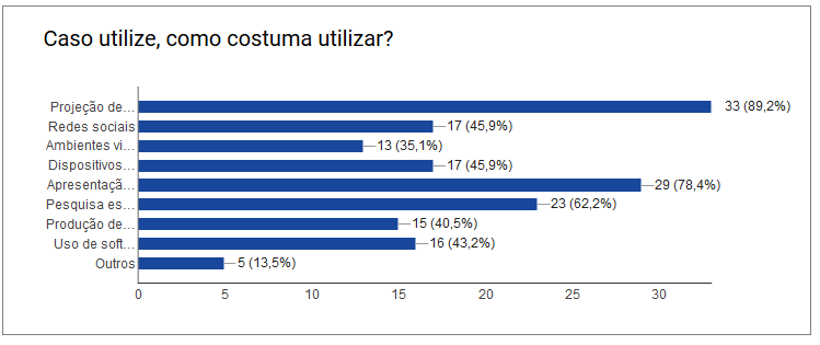 Contudo, a maior parte ainda faz essa utilização exclusivamente por meio de projeção de recursos audiovisuais, com slides e pesquisas, conforme demonstra o Gráfico 01 a seguir, sendo poucos os que utilizam outras ferramentas digitais. As opções oferecidas para os professores eram projeções de vídeos, imagens, música, redes sociais, ambientes virtuais de aprendizagens, dispositivos móveis, apresentação de slides, produção de vídeos, uso de softwares educacionais e outros recursos.