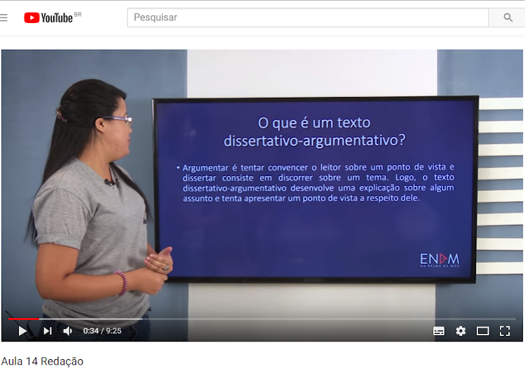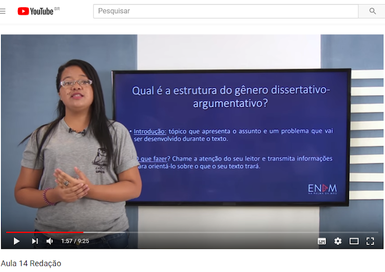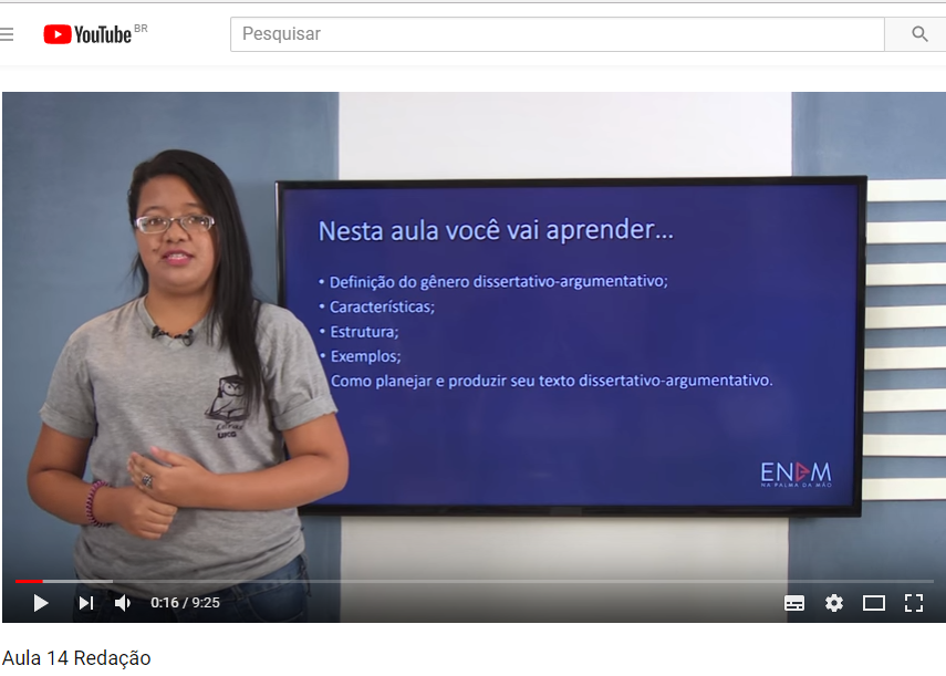 A V14 é ministrada por uma estagiária-expositora sobre o conteúdo “Estrutura e características do texto dissertativo-argumentativo”, que ocorre em 08 minutos e 41 segundos. Sua organização se dá por meio de definições, estrutura e características da redação, além também de um exemplo de redação do ENEM 2014, seguida de explicações. Por fim, a estagiária-expositora menciona alguns pontos que não devem ser cometidos pelo candidato. A sequência das estratégias de abordagem mencionadas pode ser ilustrada nas figuras seguintes.