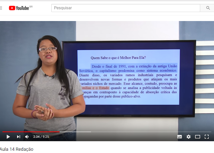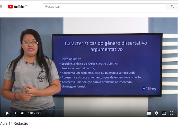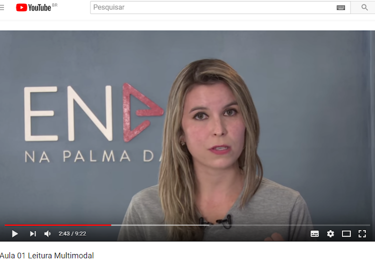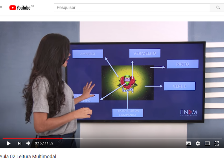 Ao todo, produziram-se quatro módulos e 17 videoaulas. Para cada uma das videoaulas, havia um estagiário assumindo a função de professor, exibindo temas tratados igualmente nos módulos. Vale salientar que, em função de alguns problemas técnicos, foram postadas 13 videoaulas e são as que estão disponíveis no YouTube. Sendo assim, em detrimento do nosso objeto de estudo, nos deteremos na análise de quatro videoaulas3: a primeira (V1) acerca do conteúdo “Leitura de textos multimodais (Tirinha e Charge)”; a segunda (V2), “Leitura de textos multimodais (Propaganda e Campanha Publicitária)”; a terceira (V14), “Estrutura e Características do gênero dissertativo-argumentativo”; e a quarta (V15), “Coerência, Coesão e Operadores argumentativos”. As duas primeiras fazem parte do eixo da leitura e as duas últimas do eixo da escrita.