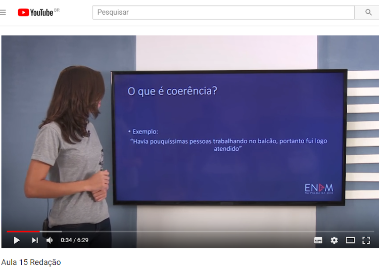 No que se refere a V15, presente também no eixo da escrita, temos um outro tipo de conteúdo abordado, mas com a mesma estratégia de abordagem. Sua exposição é desempenhada por uma estagiária-expositora sobre o conteúdo “Coerência, coesão e operadores argumentativos”, cuja duração para a ministração do conteúdo é de 5 minutos e 48 segundos. Ela está organizada por meio de definições, exemplos e explicações, tendo a definição da coerência como momento introdutório, sem o auxílio do slide, apenas com a câmera em direção à estagiária-expositora. Observemos o trecho seguinte:
