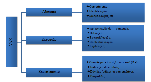 A Figura 02, “Estrutura das videoaulas”, evidencia uma estrutura modelar que se aplica às quatro videoaulas analisadas. O VX é indicador dessa generalização. A distribuição de três caixas denominadas de “abertura”, “execução” e “encerramento” destaca a previsibilidade do evento, que se organiza em torno de três movimentos clássicos: introdução; desenvolvimento e conclusão.