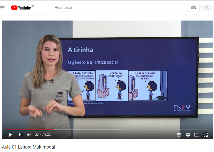 A V1 aborda o conteúdo “Leitura de gêneros multimodais (Tirinha e Charge)”. Sem contar com o tempo utilizado para abertura e encerramento, sua exposição é realizada em 08 minutos e 13 segundos, cuja ministração é desempenhada por uma estagiária-expositora que inicia o conteúdo com a definição de “Textos multimodais”, utilizando o slide como auxílio. Após a leitura deste slide, há a exibição de uma tirinha do personagem Armandinho. Na sequência, ocorre um percurso semelhante com o gênero charge, com um apontamento para suas características, com exemplificação e explicação. Tal percurso aponta para o processo de didatização mencionado por Mendes (2005), em que a estagiária-expositora demonstra e revela o modo como organizou e didatizou o conteúdo em questão. Sua fala procura situar, sem deixar dúvidas, o conteúdo tratado. O print evidencia a caracterização explicitada no vídeo. Vejamos: