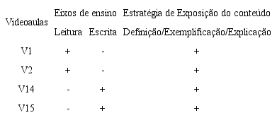 O quadro 01 revela a estrutura funcional das videoaulas, a partir da identificação da estratégia utilizada para a explicitação de conteúdos de eixos de ensino diferentes. A presença dos sinais (+/-) destaca o tipo de exposição do conteúdo nos eixos de leitura e de escrita, caracterizando o escopo da investigação para as videoaulas, V1 e V2, relativas à leitura e para as V14 e V15, relativas à escrita.