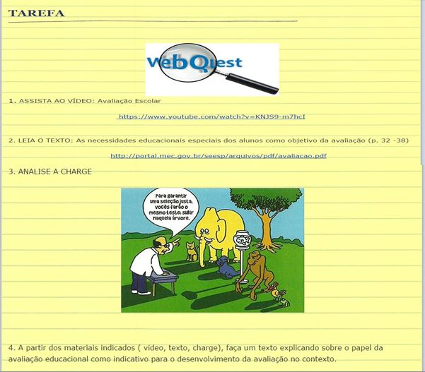 Para Pimentel (2007, p. 4), “adequar o espaço virtual à educação é uma tarefa que exige muita disciplina e um espírito de pesquisa”. Dessa forma, a enunciação da atividade, antes mesmo de mostrar seu desenvolvimento, teve como propósito instigar o aluno a refletir sobre como iria fazê-la. Com essa indicação e entendimento da tarefa realizada, os passos a serem seguidos pelos alunos foram apresentados na página “Processo”, na qual disponibilizamos links e objetivos propostos: assistir ao vídeo e evidenciar o conceito e a importância da avaliação educacional, ler o texto “As necessidades educacionais especiais dos alunos como objetivo da avaliação” e grifar as partes significativas sobre o processo avaliativo, analisar a charge e refletir sobre os subsídios e indicativos para avaliação da aprendizagem de cada aluno e, a partir das atividades propostas, sistematizar suas ideias e elaborar um texto com o tema: o papel da avaliação educacional como indicativo para o desenvolvimento da avaliação no contexto.