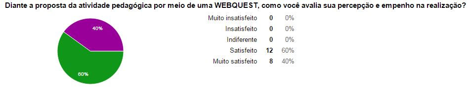 Esta seção apresenta a análise das percepções, das avaliações e das considerações dos vinte alunos participantes na realização da Webquest, coletadas pelo questionário disponibilizado na página “Queremos ouvir você!”. No que se refere à percepção e ao empenho na realização da atividade pedagógica, por meio de uma ferramenta tecnológica, os resultados mostrados no gráfico 1 indicam que 12 participantes, ou seja, 60%, sentiram-se satisfeitos, e 8 deles, 40%, sentiram-se muito satisfeitos ao realizar a atividade.