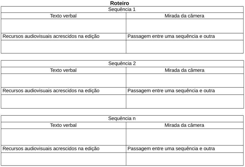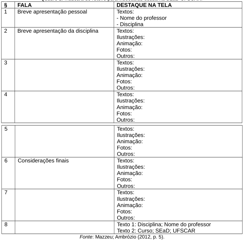 Ainda que haja algumas variações de formatação de uma instituição para outra, o padrão mais comum de instrumentos para roteirização de videoaulas pouco difere do modelo apresentado no Quadro 1: