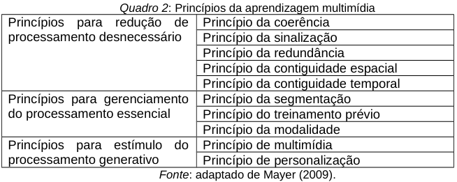 A seguir, detalha-se cada um dos princípios da aprendizagem multimídia apresentados no Quadro 2: