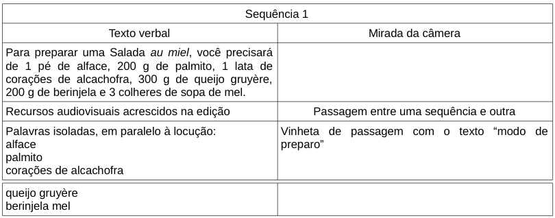 A seguir, você encontra um exemplo de sequência roteirizada, a fim de explicitar os procedimentos para planejamento de sua videoaula.Na coluna “texto verbal”, escreva o texto que você enunciará naquela sequência.