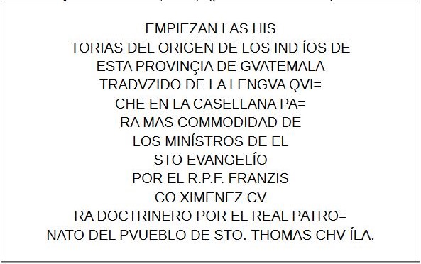 Na transliteração do códice para o alfabeto latino, realizada no século XVI, fixava-se uma das etapas de um processo de transculturalização. Quando se integraram elementos contextuais, referências meta-poéticas, geográficas e temporais, segundo as ponderações de Craveri (2012, p. 18), foram inseridos dados que seriam supérfluos em um processo de transmissão oral, e esse corpus passou a destinar-se a uma comunidade submetida a violentos processos de mudança. “O que quero sublinhar é que o manuscrito de Ximénez (1700) apresenta marcas formais de uma tentativa de integração de elementos contextuais a um texto oral, que não podia ser decodificado através do tempo e do espaço” (CRAVERI, 2012, p. 28). Supõe-se (LÓPEZ, 1999, p. 100) que este manuscrito foi realizado em Santa Cruz del Quiché, que ficava próximo de Q´umarkaaj, capital do reino, que em 1524 foi tomada e destruída pelos espanhóis. Posteriormente, não se sabe como, o texto foi levado a Chichicastenango, onde o frade domínico Francisco Ximénez o encontrou e realizou a transcrição do K’iche, seguida da tradução para o castelhano. O frade teria finalizado a tradução durante o período que residiu em Rabinal. Francisco Ximénez (1700) realizou uma série de obras sobre a cultura maia, algumas descritivas, outras tradutológicas. O manuscrito foi levado a Áustria por Scherzer em 1854 -quem o traduziu para o alemão sob o mesmo título do padre Ximénez: “Las Historias DEL ORIGEN DE LOS INDIOS de esta Provincia de Guatemala, traducidas de la lengua Quiché al Castellano para más comodidad de los Ministros del S. Evnagelio, por el R.P.F. Francisco Ximénez”. Juntamente com os los Escolios e a Intodução as quais acrescentou notas (1857). Posteriormente retornou para os Estados Unidos com um colecionador, Eduard Ayer, depois de ser revendido duas vezes. O Manuscrito de Chichicastenango encontra-se hoje na Newberry Library de Chicago, sob o código Ayer MS 1515.