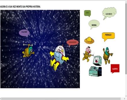 A atividade de construção de história, por exemplo, disponível em uma das abas, apresentava a proposta de colocar à disposição das crianças alguns ícones com o cenário, as imagens dos personagens que compunham a história em quadrinhos apresentada no livro digital e balões que representavam a fala de cada um deles (Figura 1-D). Nessa atividade as crianças surdas poderiam reconstruir o texto lido ou construir seus próprios textos. A atividade de construção de história, portanto, só foi realizada pelas crianças após a leitura do livro digital.