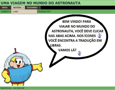 Ainda antes de iniciarem a atividade, o professor resumiu o conteúdo dos quadrinhos em Libras: explicou que a história se passava no espaço com o Astronauta e, enquanto isso, na Terra, os personagens (Cascão e Cebolinha) não sabiam de nada que acontecia lá.