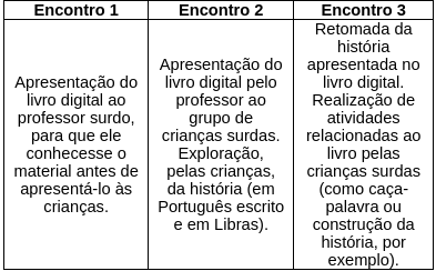 O grupo de crianças surdas que interagiu com o livro digital[6] foi constituído por um total de seis crianças, sendo todas do sexo feminino com idades entre 7 e 11 anos. Todas elas já participavam de encontros semanais em uma instituição no interior do estado de São Paulo envolvendo-se em atividades nas quais o professor surdo responsável pela turma tinha como o objetivo desenvolver conhecimentos no Português como segunda língua por meio de interações realizadas diretamente em língua de sinais. Durante as sessões de interação com o livro digital observados, cada criança foi alocada diante de um computador no qual era possível acessar o livro e suas atividades e com possibilidade de conexão com a internet. No total, foram realizados três encontros, nos quais todos os conteúdos das abas do livro digital foram explorados pelas crianças com a mediação do professor, como apresentado na Tabela 1 a seguir.