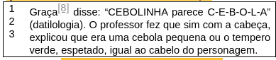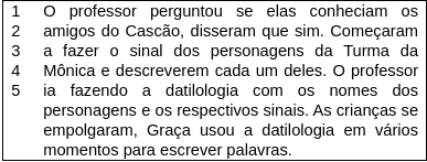 Observamos que as hipóteses em relação ao Português vão sendo construídas, sobretudo com base na proximidade da forma escrita de algumas palavras. O que chama a atenção de Graça (Linha 1 – Quadro 1), por exemplo, é o fato da grafia do nome do personagem Cebolinha se assemelhar à grafia da palavra cebola. Por meio do uso do sinal do personagem e do Alfabeto Manual em Libras a criança expõe ao professor suas hipóteses, que são retomadas e ampliadas por ele ao fazer menção à grafia da palavra e também ao aspecto imagético do texto, isto é, ao formato do cabelo do personagem, que lembra o formato do bulbo de uma cebola: “[...] uma cebola pequena ou o tempero verde, espetado, igual ao cabelo do personagem” (Linhas 2-3 – Quadro 1).