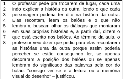 No trecho anterior, vemos que o professor surdo, além de pedir para que as crianças contem as histórias de seus colegas (Linhas 1-2 do Quadro 3), explica, ao final de sua aula, que essa foi a estratégia por ele utilizada para que pudesse verificar se as crianças estavam lendo, de fato, o conteúdo escrito dos balões de conversa ou apenas os memorizando visualmente (Linhas 5-8 do Quadro 3). O uso do recurso imagético, nesse caso, desenhos de personagens e balões de conversa, em lugar de ser visto como um auxílio no contato da criança surda com a escrita, assim como apontou Gesueli e Moura (2006), mostrou-se mais como um recurso que levantou suspeita por parte do professor surdo a respeito do comportamento leitor das crianças surdas, isto é, sua dúvida era se as crianças estavam “[...] conseguindo ler, se apenas decoraram a posição dos balões ou se apenas se lembram do significado das palavras pela cor do balão” (Linhas 6-7 do Quadro 3).
