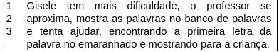 O trecho destacado no Quadro 4 foi registrado durante o momento em que as crianças, após terem lido o livro, realizavam a atividade de caça-palavras. Gisele, uma das crianças, tem dificuldades para iniciar a atividade e o professor mostra as palavras que ela deveria procurar e, em seguida, a primeira letra de uma das palavras que ela procurava (Linhas 1-2 do Quadro 4). A partir daí, a criança começa a buscar sozinha outras palavras reproduzindo a ação de seu professor.