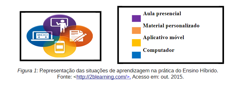Através da união do ensino presencial ao virtual, dentro e fora do âmbito escolar (representado esquematicamente na Figura 1), os alunos são expostos a diversas situações de aprendizagem. De acordo com esse método, busca-se a personalização do ensino, com e sem o apoio docente, alternando momentos em que os alunos estudam virtualmente e/ou presencialmente, sozinhos e/ou em grupos. Por intermédio dessa integração, passam a ter acesso a um aprendizado que, além de respeitar suas necessidades e interesses, preocupa-se com seu próprio ritmo de assimilação do conteúdo. Os encontros presenciais são importantes aos alunos à medida que contribuem para dirimirem suas dúvidas, socializarem ideias construídas previamente e aprofundarem conceitos por meio da troca de saberes entre professor-aluno e aluno-aluno.