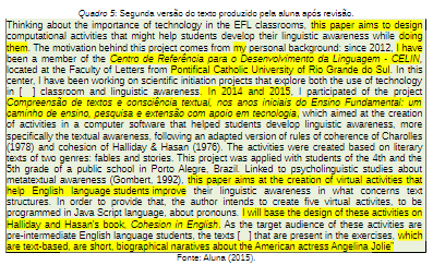 Apresentamos, abaixo, alguns segmentos do texto original da mesma aluna (primeira versão), revisados por um colega seu, que destacou (em amarelo) partes a serem melhoradas e fez sugestões (em azul), similares àquelas feitas paralelamente pelas professoras. Os comentários adicionais (em roxo) foram indicados apenas pelas professoras.
