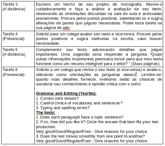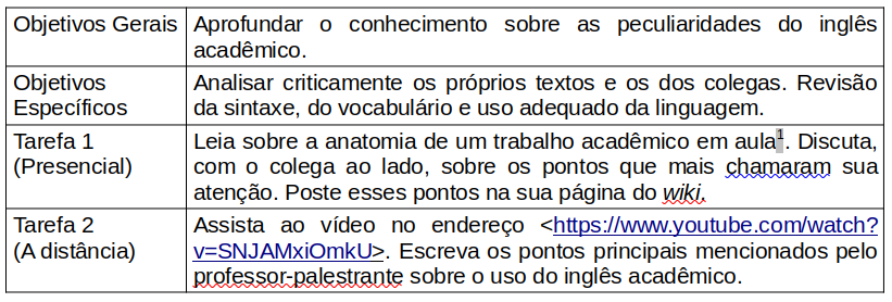 Com referência à vivência de ensino propriamente dita, apresentaremos uma unidade didática sobre o uso do inglês acadêmico para o gênero monografia, incluindo objetivos gerais, objetivos específicos, três tarefas presenciais e três tarefas a distância. Além disso, mostraremos produções feitas pelos discentes[2], incluindo as avaliações entre os pares, o feedback (“resposta”) formativo dado pelas professoras-autoras e a percepção crítica da pergunta norteadora, apontando pontos favoráveis e limitações da experiência.