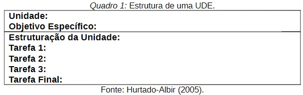 Exemplificamos, a seguir, nos Quadros 1 e 2, a estrutura de uma UDE e a estruturação de uma tarefa, propostas pela autora: