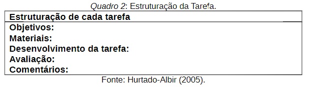 Desse modo, consideramos que o desenho de um curso nesse formato consista no sequenciamento de tarefas, que se constituem em unidades didáticas de aprendizagem, as quais organizam o processo de aprendizagem. As características de uma tarefa, conforme Zanón (1990), são as seguintes: i) ser representativa de processos de comunicação na vida real; ii) ser passível de identificação como unidade de atividade durante a aula; iii) estar dirigida intencionalmente ao aprendiz; e iv) estar desenhada com um objetivo, uma estrutura e uma sequência de trabalho.
