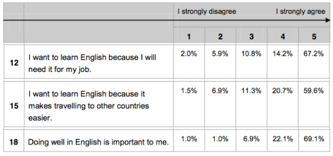 The high approval ratings were also due to the straightforward need for English language into branching out world citizenship. The importance of EFL foremost weighs on the concept of Lingua Franca, and a few questions in the survey were devoted exclusively to completing this picture. For example, Table 1 reveals students strongly relying on English to work (question 12), to communicate globally (question 15), and as personal achievement (question 18).