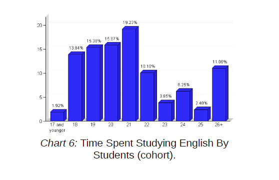 Naturally, a good evaluation of the program is deeply connected to the students’ perception of learning and the effectiveness of learning. Therefore, results should be read in perspective because they unfold complex connections and the intertwining mesh of learning and background for UA undergraduate students. The Charts 5 and 6 below will help to understand this melting pot.