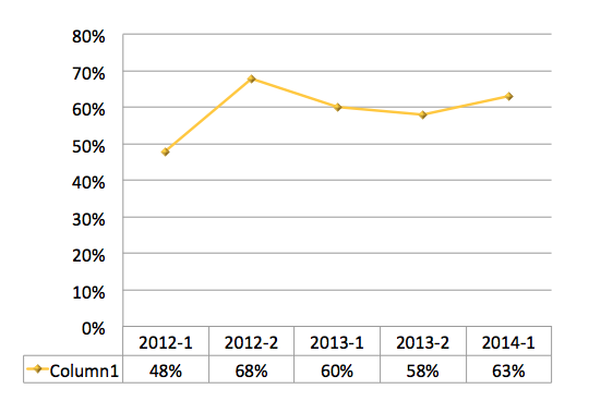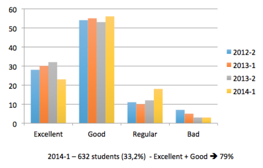 The students’ satisfaction rate with the program was measured by anonymous semi-annual surveys carried out by teachers in the classroom. The surveys happened from 2012-2 to 2014-1 and the results were very promising (Chart 4).