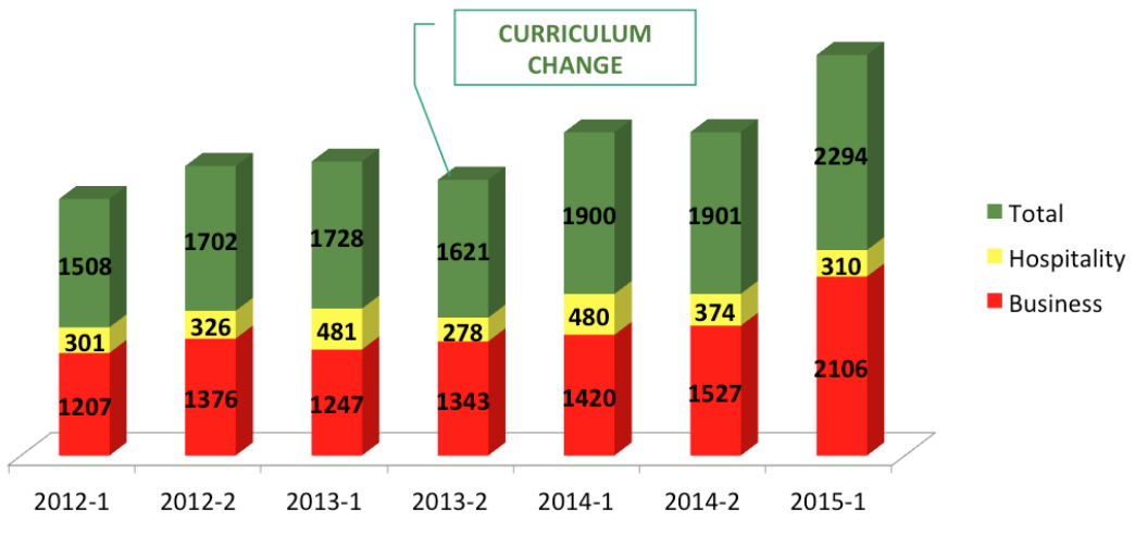The base of students who attended the program had a steady growth – except for 2013-2, when the discipline onset was shifted from the first to the second semester. School of Business and Hospitality topped 2294 students in 2015-1[2], as depicted in the Chart 1.