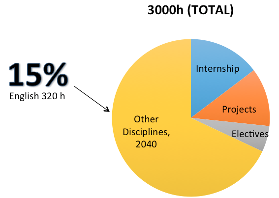 The total share of English (discipline) in the curricula was big on the whole. For example, in majors with four semesters of English – which bear the most part of the enrolled students – English took 15% (320 hours), or thereabouts, of the total study load (3000 hours). This proportionality is represented in the Chart 2.