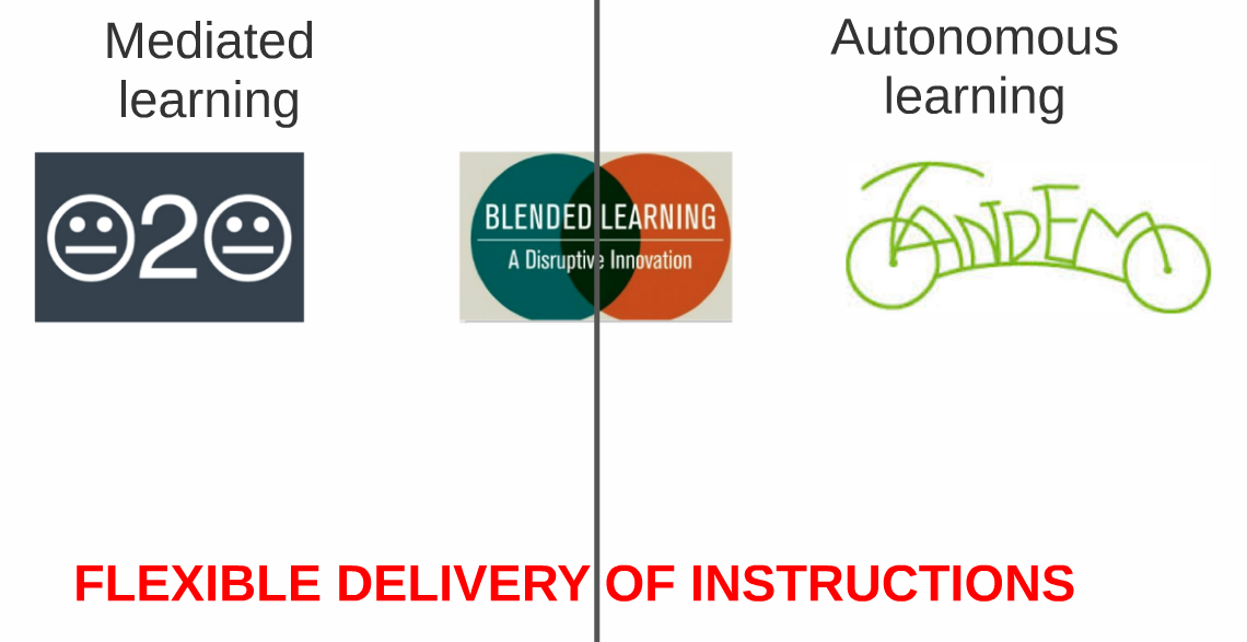 Adopting the bold strategy of meeting the criteria of breadth, the methodological approaches sought to create an EFL flexible delivery of instructions (mediated and autonomous) with views to the development of higher-order thinking skills. Figure 1 represents how the adopted methodological approaches were complementary: face-to-face classes (mandatory), B-learning (optional/ meritocracy policy), and tandem learning (pilot project).