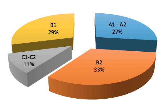 The levelling (or grouping) for F2F classes progressed in search of accreditation and quality ratings. The following steps were then taken: (1) as soon as students started out in the program as sophomores, they took a proficiency test to be placed (c.f. CEFR); (2) students were then divided into groups – max 30 students; (3) groups were optimized in pools[3] from 2014-1 and so forth. Despite the effort to meet students’ individual needs through placement tests, the levelling of classes faced a major crux on occasion of the detection of more levels within a group than the number of groups (classes) offered. The Chart 3 provides a sample of the students’ entrance levels (proportion) in one of the university campuses.