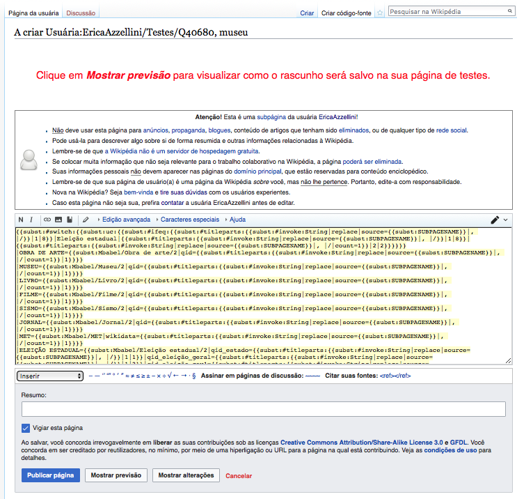 Em seguida, o usuário é direcionado para a sua página de testes, na qual pode visualizar uma previsão de como o verbete está estruturado, já com as informações do Wikidata inseridas no template escolhido em linguagem natural. Ao clicar em “publicar página”, o usuário pode começar a editar o verbete em sua página de testes pelo código-fonte ou por um editor visual da Wikipédia, sem precisar lidar necessariamente com códigos de programação. Depois que ampliar o rascunho estruturado com mais informações e contexto e realizar as devidas revisões no verbete, seguindo os padrões exigidos pela Wikipédia, o editor pode publicar o texto do verbete no domínio principal.