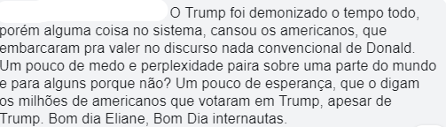 Koch, Bentes e Cavalcante (2012) observam ainda que a metatextualidade estabelece uma relação intertextual temática, pois, está pressuposto que o comentário produzido mantém a progressão do tema desenvolvido no texto-fonte, conforme pode ser verificado no exemplo a seguir, em que o comentário do interactante se refere ao artigo da jornalista Cantanhêde sobre as eleições americanas, em que os principais candidatos eram Hillary Clinton, do partido americano Democrata, e Donald Trump, do partido americano Republicano, no ano de 2016: