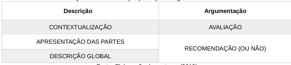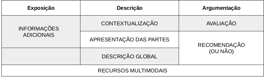 A estrutura descrita no quadro compreende duas macrocategorias correspondentes às sequências tipológicas, descritiva e argumentativa, que se reproduzem nos textos do gênero resenha. A primeira macrocategoria pode se recopilar em três movimentos: destaque para as informações a respeito do contexto, tema, autor e público-alvo, que denominamos contextualização, o relato do conteúdo, nomeado por apresentação das partes, e a descrição global, representativa das informações e intertextualidades relativas às partes do objeto resenhado.