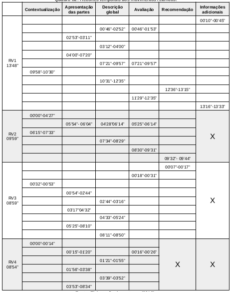 A representação do quadro acima baseia-se em recortes temporais aproximados e categorizados a partir dos períodos em que os movimentos retóricos elencados são mais destacáveis, pois, por se tratar de um texto oral em um evento comunicativo com menor rigor formal, a organização dessas etapas não são estanques, mas, em diversos momentos, a apresentação do enredo e avaliação da obra ocorrem simultaneamente, bem como as descrições e a recomendação, as informações gerais e a contextualização, etc.