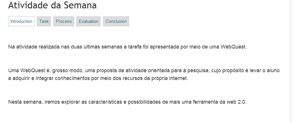 No item processo, foram propostos os passos para a realização da tarefa em duas fases. Na primeira fase, os aprendizes observaram as características das WebQuests indicadas e postaram suas impressões no WIGGIO. Na segunda fase, aprofundaram no tema a partir de leituras teóricas tanto dos links indicados quanto de fontes pesquisadas pelos próprios participantes. É interessante ressaltar que as orientações foram precisas e flexíveis, isto é, o aprendiz contou com uma série de instruções que procurou facilitar a compleição da execução da tarefa, porém, possuía uma liberdade para buscar recursos que melhor atendessem às suas necessidades em relação à sua própria aprendizagem.