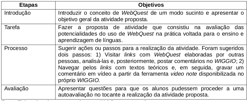 Cabe salientar que o incentivo a refletir na e sobre a ação (SCHÖN, 1983, citado por DIAS, 2012, p. 11) proporcionou um conhecimento experiencial, bem como teórico-metodológico, que se fazem essenciais e significativos na formação do professor. Desse modo, faz-se necessário observar também os fatores pertinentes à proposta que contribuíram para que os aprendizes tomassem atitudes mais autônomas. No quadro, a seguir, podemos observar os objetivos subjacentes as etapas que constituíram a WebQuest em estudo.