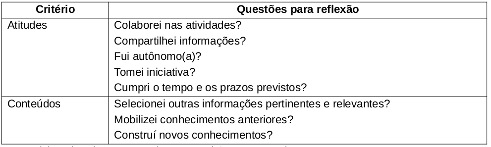 É possível observar que o desenvolvimento da autonomia não é “simplesmente uma questão de colocar os aprendizes em uma situação em que eles devem ser independentes” (AL-BUSAIDI; BORG, 2012, p 5). O desenvolvimento da autonomia envolve fatores mais complexos, como a consciência em relação ao próprio processo de aprendizagem, bem como a reflexão e pensamento crítico no que tange às escolhas e decisões necessárias a esse processo. Foi possível notar na etapa de Avaliação, um estímulo à conscientização e reflexão em relação ao processo de aprendizagem por meio da autoavaliação. No quadro que segue, são apresentados os elementos utilizados para proporcionar ao participante a autoavaliação.