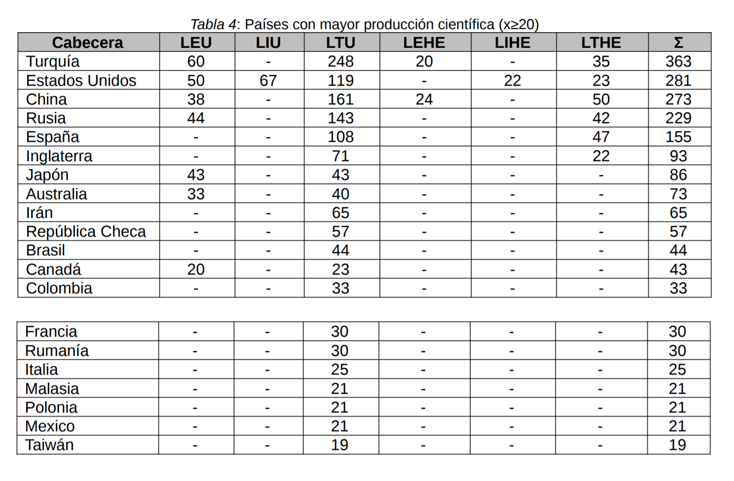 En cuanto a la productividad geográfica, un total de 21 países han superado los requisitos de inclusión, convirtiéndose así en los más prolíficos en cuanto a la investigación analizada (Tabla 4). Encontramos, de este modo, una mayor producción científica proveniente de Turquía (12,2%), Estados Unidos (9,4%), China (9,2%) y Rusia (7,7%).