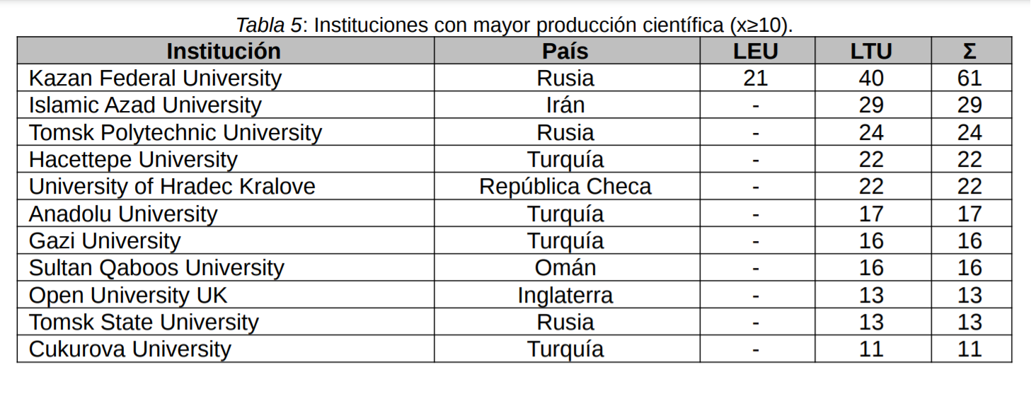 Se ha hallado una mayor producción científica en la colección principal de la Web of Science que proviene de investigadores de Turquía, siendo este el país que más ha producido al respecto. Destacan, a su vez, estudios de Estados Unidos, China, Rusia y España. A su vez, cuatro universidades de Turquía (Anadolu University; Cukurova University; Gazi University; Hacettepe University) se encuentran dentro de las instituciones más productivas científicamente. Sin embargo, por su mayor cuantía de trabajos publicados al respecto, destacamos la labor de la universidad rusa Kazan Federal University.
