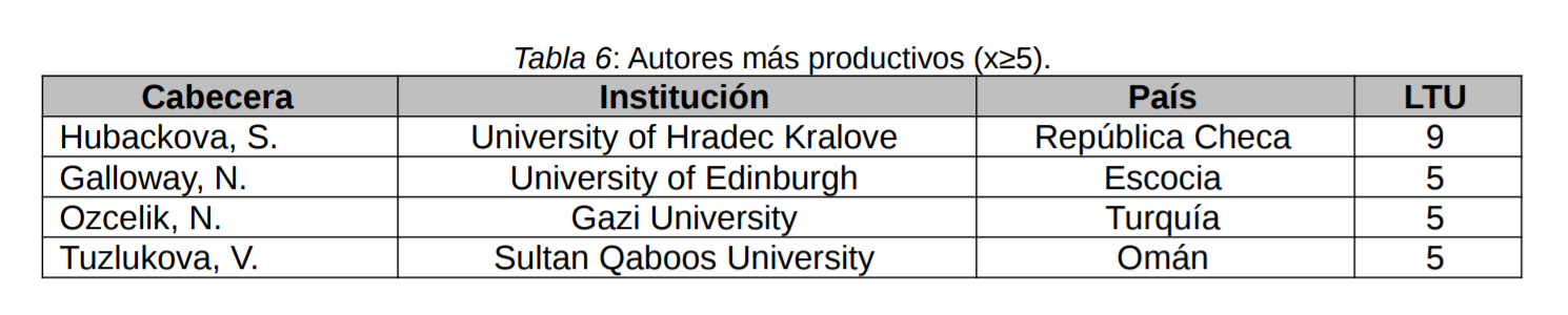 Respecto a la autoría de los trabajos, no se han encontrado autores verdaderamente prolíficos al respecto, salvo la autora checa Sarka Hubackova, de la University of Hradec Kralove, que cuenta con un total de nueve publicaciones al respecto.